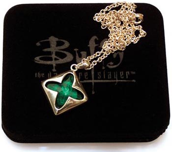 Genki Wear is proud to present the first piece from its Buffy The Vampire Slayer Prop Replica Jewelry Collection - Anyanka’s Power Center Amulet and Necklace. Fully licensed by 20th Century Fox, Anyanka’s Amulet is recreated in astonishing detail by the highly-skilled craftspeople at Genki Wear. Developed and approved using reference from the 20th Century Fox Archives, this gold-plated chain and simulated emerald stone are presented in a velvet enclosed jewelry box milled with the official Buffy the Vampire Slayer logo resting on the lid." Click on the link : |